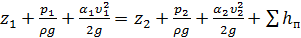 где Н - полный гидродинамический напор (полная удельная энергия жидкости в сечении); Z – вертикальная координата центров тяжести сечений (геометрический напор); В реальных жидкостях проявляется влияние сил внутреннего трения, обусловленных вязкостью, на преодоление которых расходуется определенное количество кинетической энергии или скоростного напора h. Уравнение Бернулли для двух сечений потока реальной жидкости записывается в следующем виде