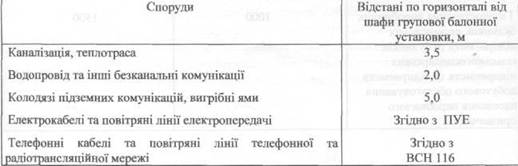 9.37 ГБУ слід вважати установку газопостачання, до складу якої входить більше двох балонів. В кожному конкретному випадку застосування групової балонної установки повинно бути обгрунтовано. 9.38 В складі ГБУ передбачають балони для ЗВГ, колектор високого тиску, регулятор тиску газу або регулятор-перемикач автоматичний, загальний вимикаючий пристрій, манометр, 3CKта трубопроводи. При наявності в регуляторі тиску вбудованого 3CKустановка додаткового клапану не потрібна. 9.39 Число балонів в одній ГБУ визначають розрахунком, виходячи із годинної витрати газу та продуктивності одного балона в залежності від температури навколишнього повітря, марки газу та тривалості відбору газу. 9.40 Максимальну сумарну місткість балонів в ГБУ приймають за таблицею 24. 9.41 ГБУ розміщують в шафах із негорючих матеріалів або під захисними кожухами. Розміщення ГБУ передбачають безпосередньо біля будинків або на відстані від будинків, не менше зазначеної в таблиці 25 та від споруд на відстані, не менше зазначеної в таблиці 26.