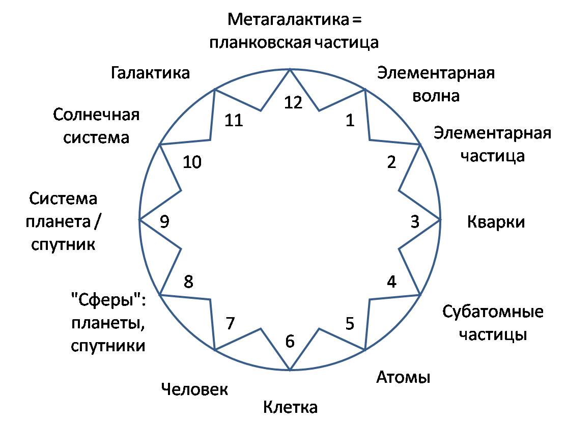 Из этого делаем вывод, что циферблат с двенадцатеричным делением – это отголоски предыдущей цивилизации, как минимум владеющими теми же знаниями, что и мы сейчас. Ниже мы увидим, что такие знания могут быть легко достижимы и носят естественный характер. Мы состоим из метагалактик, и наша метагалактика является самой маленькой частицей следующего большего мира: что на небе то и на земле (в материи). Мир высшего уровня состоит из метагалактик аналогичных нашей (для нее, наша метагалактика является самой маленькой частицей). Общая картина мира представляется так: