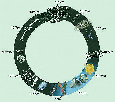 Или: (1025/10-35)3=(1060)3=10180 – планковских частиц существует в метагалактике. Это гармонично вписывается в ландшафт теории струн, предполагающей существование от 10100 до 10500 вариантов так называемых ложных вакуумов. 7. Все, гармонично связанные воедино, описанные доказательства цикличности и периодичности мироздания. Периодический закон выполняется всегда и везде. Это доказывает его цикличность. 8. Планковская частица и метагалактика, оба являются «черными дырами». Метагалактика обладает как квантовыми, так и макросвойствами – это особый вид взаимодействия структурных сил. 9. Выводы фрактальной теории (теории бесконечной вложенности материи). Всё – это взаимное движение метагалактик, которых нет. Мир стабилизировался эволюционно. То, что материя делится до бесконечности, утверждали ещё Аристотель, Декарт и Лейбниц в своей монадологии. В каждой частице, какой бы малой она ни была, «есть города, населённые людьми, обработанные поля, и светит солнце, луна и другие звёзды, как у нас» — утверждал греческий философ Анаксагор в своём труде о гомеомериях в V веке до нашей эры. Этот принцип, изречённый более двух тысяч лет назад, был принят за аксиому последователями герметической религиозной философии. Это течение времён поздней античности, из которого в Средние века родилась алхимическая наука, и которое явилось предтечей трёх движений, частично доживших до наших дней: движения иллюминатов, франкомасонства, и движения розенкрейцеров. Многие виднейшие учёные Средневековья и Нового времени были связаны с какими-либо из этих движений, главным образом потому, что эти организации хранили у себя недоступную простым смертным информацию. Герметисты утверждали аналогию между микро- и макрокосмосом: в религиозном смысле, эта аналогия понималась как соответствие Бога и человека, созданного по образу и подобию Божьему. Однако, в науке утверждение о всеобщей аналогии может пониматься и гораздо шире. Стихотворение «Мир электрона» Валерия Яковлевича Брюсова: Быть может, эти электроны Миры, где пять материков, Искусства, знанья, войны, троны И память сорока веков! Ещё, быть может, каждый атом - Вселенная, где сто планет; Там — всё, что здесь, в объёме сжатом, Но также то, чего здесь нет. Упоминание в Индуизме множественности вселенных в Пхагавата-Пурана 6.16.36-37: «Ты существуешь в начале, в середине и в конце всего, от самой маленькой частички космического проявления — атома — до гигантских вселенных и всей материальной энергии. Тем не менее, Ты вечен, не имея начала, конца или середины. Ты воспринимаешься, чтобы существовать в трех этих фазах, и таким образом Ты являешься неизменным. Когда это космическое проявление не существует, Ты существуешь, как изначальная потенция… Есть бесчисленные вселенные за пределами этой, и несмотря на то, что они бесконечно велики, они вращаются в Тебе, подобно атомам.» Изречение Иисуса Христа: «Что на небе, то и на Земле», можно трактовать, как: «что в макромире, то и в микромире». 10. Интуитивная естественность. Сознание не сопротивляется (естественность восприятия - не чувствуется подвоха; чувствуется «эврика» - «оргазм мозга»). 11. Бесконечный звукоряд. Он не "останавливается". 12. Было бы неразумно оставить Мироздание разомкнутым (нет ничего до Платковской частицы и нет ничего больше метагалактики). Определяем точку зрения: не 