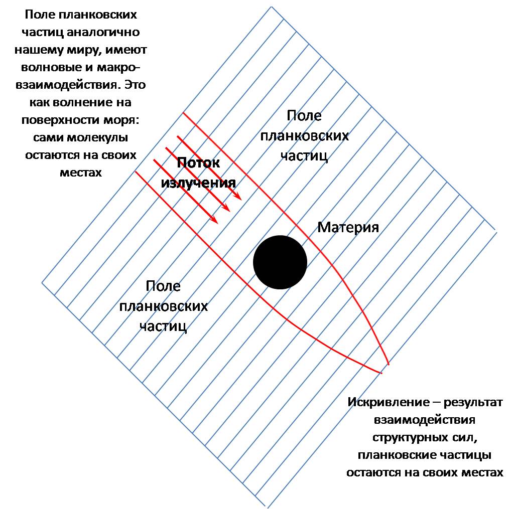 При гравитационном взаимодействии искривляется не пространство, а "состояние поля" (поле планковских частиц – "эфир"; планковские частицы – корпускулы); силы – следствие взаимодействия; идет взаимодействие "структурных" сил ("матрица состояния"):