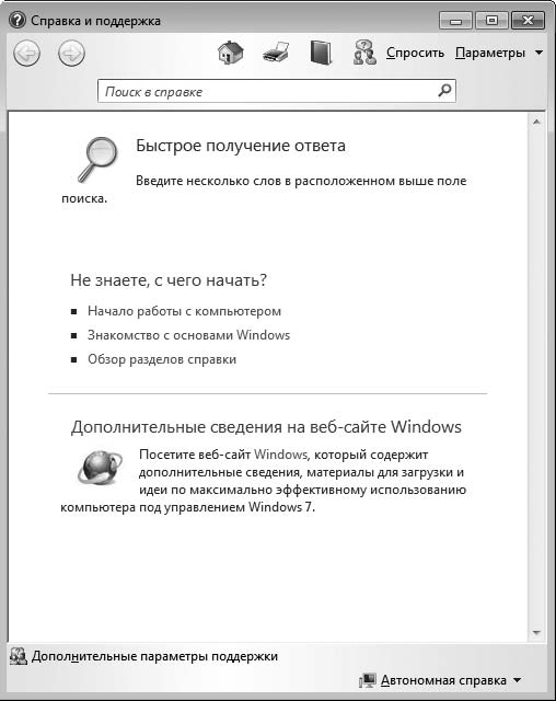 Домашняя страница справочной системы содержит несколько основных ссылок. • Начало работы с компьютером – то, что обязательно следует прочитать каждому начинающему пользователю. В этом разделе объясняются главные понятия и показываются приемы работы в Windows. • Знакомство с основами Windows – открывает обозреватель Internet Explorer и направляет вас на сайт корпорации Microsoft, где можно найти самые свежие и подробные сведения о системе Windows 7 как для начинающих, так и для «продвинутых» пользователей. Разумеется, компьютер при этом должен быть подключен к Интернету. • Обзор разделов справки – ссылка на полное оглавление справочной системы; чтобы ею воспользоваться, вы уже должны представлять, что конкретно ищете и хотите узнать. В верхней части окна расположены кнопки со стрелками Назад