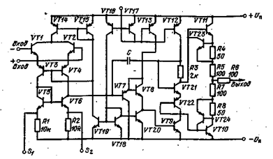 Схема токового зеркала, используемая для питания дифференциального каскада и реализованная на транзисторах VT3 и VT4, описывается следующим соотношением: S = I0/I3 = h21E/(h21E+2). Если коэффициент передачи тока транзисторов VT3 и VT4 уменьшается до 20, что вполне реально для малых коллекторных токов, то отношение 5 равно 0,9 вместо 1, т. е. появляется погрешность передачи токов. Для уменьшения этой погрешности обычно применяют более сложные схемы токового зеркала, позволяющие получить значительно меньшую погрешность при равном коэффициенте передачи тока используемых транзисторов. Так, схема, реализованная на транзисторах VT13 — VT15, обеспечивает коэффициент усиления K=0,9 при коэффициенте передачи по току h 21Е = 4 и описывается выражением