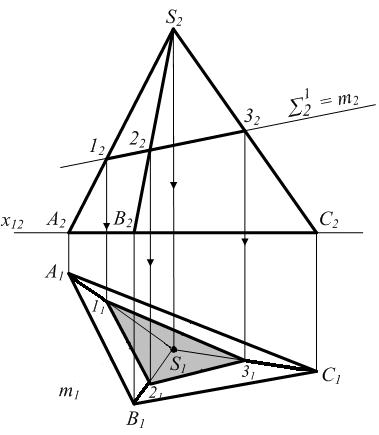 В сечении поверхности плоскостью получается плоская фигура, которую строят по точкам. При этом начинают построение с опорных точек - точек, лежащих на линиях контура, ребрах и линиях основания поверхности. Если проекция линии пересечения этими точками не определяется полностью, то строят дополнительные промежуточные точки. Чертеж всегда можно преобразовать заменой плоскостей проекций так, чтобы секущая плоскость стала проецирующей. Поэтому начнем рассматривать случаи пересечения поверхности и плоскости частного положения. Вариант А-1. Плоскость и поверхность являются проецирующими к разным плоскостям проекций