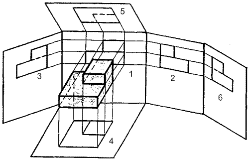 Основные виды: 1 - главный вид; 2 - вид слева; 3 - вид справа; 4 - вид сверху; 5 - вид снизу; 6 - вид сзади. Рисунок 7.1