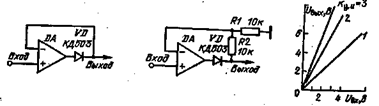 Идеальный диод. Полупроводниковые диоды не пригодны для выпрямления малых сигналов. Это обусловлено тем, что для появления проводимости кремниевым диодам требуется напряжение прямого смещения около 0,7 В, а германиевым — около 0,3 В. Если диод включить на выходе ОУ, то пороговые напряжения диодов будут уменьшены в Kу.и раз, где Kу-u — коэффициент усиления интегральной микросхемы. В результате этого диод начинает проводить при входных сигналах в несколько милливольт. Первая схема на рис. 2.22 имеет коэффициент усиления, равный единице. Во второй схеме коэффициент усиления можно менять при изменении сопротивлений резисторов Kу.и = 1 + R2/R1. Управляемый идеальный диод. Для настройки схемы на вход ОУ следует подать напряжение смещения ±304-50 мВ. Это смещение необходимо для выравнивания разбросов падения напряжения на диодах. В сбалансированной схеме при отрицательной полярности входного напряжения на выходе остается нуль. При входном напряжении 10 В на выходе будет приблизительно 1 мВ. Для положительного входного напряжения схема работает как диод в прямом направлении. Коэффициент усиления схемы равен Rd(Ri+R2). Выходной ток схемы определяется сопротивлением резистора R1. Для увеличения выходного тока необходимо поставить два транзистора. Транзистор VT1 (рис. 2.23) разгружает интегральную микросхему от большого тока при отрицательной полярности входного сигнала. Положительная полярность входного сигнала проходит через транзистор VT2. Он же определяет выходной ток. В транзисторной схеме коэффициент усиления равен 0,99. Для уменьшения шумового сигнала на выходе параллельно диоду VD1 следует включить конденсатор, уменьшающий граничную частоту работы схемы. Без конденсатора граничная частота равна 200 кГц.