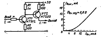 Схема преобразования сопротивления. В схеме на рис. 2.28 за счет ПОС в ОУ осуществляется преобразование сопротивления. Коэффициент передачи по току определяется выражением Iвх/Iн = R3/R2 — Rн/R1 или Rвх = Uвх/Iвх=Uвх/Iн(1 — a). при R3=R2, Rн/R1=a. Для а=1 эквивалентное сопротивление равно бесконечности. Когда же а больше единицы, входное сопротивление становится отрицательным. Транзисторный делитель сопротивлений. Делитель сопротивлений, выполненный по схеме рис. 2.29, позволяет уменьшить сопротивление входного резистора в коэффициент передачи раз. Начиная с входного тока 8 мкА, выходной ток практически пропорционален входному. Коэффициент передачи равен 500. Если на вход подан сигнал с амплитудой. UВх, то на выходе будет ток (Uвx/r)500. Следовательно, сопротивление цепи г уменьшается в 500 раз. Делитель тока. Устройство (рис. 2.30) состоит из четырех дифференциальных пар транзисторов. Максимальный ток 8 мА протекает через VT9. Этот ток задается напряжением на базе и сопротивлением резистора R6. В эмиттерах транзисторов VT7 и VT8 общий ток разветвляется. Половина тока транзистора VT9 протекает через транзистор VT8, другая половина — через транзистор VT7 к следующей паре транзисторов, где ток также делится поровну. Коллекторный ток транзистора VT6 равен 2 мА. Последующие пары транзисторов осуществляют аналогичные операции. В результате на выходах схемы происходит пропорциональное деление токов. Поскольку параметры транзисторов могут отличаться, в базах включены потенциометры, которые балансируют пары транзисторов. Вместо транзисторов в схеме можно применить интегральную микросхему К198НТ5, что значительно уменьшит габаритное размеры устройства.