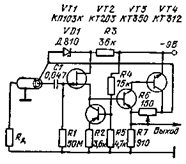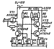 Малошумящий предусилитель. На входе усилителя (рис. 4.64) применен полевой транзистор в схеме ОИ. Второй каскад выполнен на биполярном транзисторе по схеме ОЭ. В усилителе две петли ООС. С коллектора транзистора VT2 через цепочку R6, СЗ сигнал ОС подается в исток полевого транзистора, а с истока через конденсатор С2 и резистор R3 — на затвор VTL Наличие второй ООС позволяет увеличить входное сопротивление усилителя до десятков мегаом и существенно уменьшить входную емкость. Значение входной емкости ограничивается емкостью монтажа и лежит в пределах 5 — 10 пФ. Коэффициент усиления схемы может быть выбран в широких пределах — от 1 до 100, при этом сответственно меняется и верхняя граничная частота полосы пропускания. Для коэффициента усиления, равного 4, полоса пропускания составляет 100 Гц — 40 МГц. Уровень шумов, приведенный ко входу, равен 100 мкВ при входном сопротивлении 30 МОм. Максимальное выходное напряжение равно ±1,5 В при коэффициенте гармоник не более 5 %. Диапазон температур от — 60 до +60 °С.