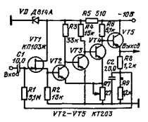 Рис. 4.68 Чувствительный усилитель. Схема (рис. 4.68) предназначена для усиления сигналов в диапазоне частот от 100 Гц до 1,2 МГц; коэффициент усиления порядка 104. Входной шум при сопротивлении генератора 5 кОм равен 40 мкВ, максимальный выходной сигнал 1,5 В, входное сопротивление 2,5 МОм. Схема содержит пять каскадов усиления. Входной каскад на полевом транзисторе VT1 выполнен по схеме с ОИ. Два последующих каскада собраны по идентичной схеме. В этой схеме для стабилизации параметров усилителя применены две цепи ООС через резисторы R3 и R6, R12 и R15.