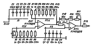 Линейный полосовой усилитель. Усилитель построен на двух ОУ типа К140УД1Б (рис. 4.90). На DAI выполнен усилитель с переменным коэффициентом усиления. Для уменьшения сдвигов постоянной составляющей на выходе DA1 изменение коэффициента усиления производится одновременным изменением резисторов как в цепи ОС, так и в неинвертирующем входе (переключатель П2). Нижняя граничная частота усиления определяется положением переключателя П1: 0,1; 6; 16; 160; 1600; 16000 Гц. Верхняя граничная частота определяется положением переключателя П3: 10; 100 Гц; 1; 10; 100 кГц и 1 МГц. Следует учесть, что ОУ типа К140УД1Б имеет спад АЧХ с крутизной 6 дБ/октава, начиная с частоты 10 кГц, так что при коэффициенте усиления 500 верхняя граничная частота усилителя будет равна 5 кГц.