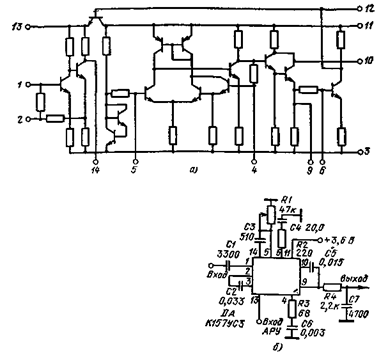 Усилитель промежуточной частоты с АРУ на микросхеме К157УСЗ. Принципиальная схема К157УСЗ приведена на рис. 4.91, а, а периодический УПЧ на ней на рис. 4.91,6. В усилителе интегральная микросхема выполняет несколько функций. В ней происходит усиление сигнала с частотой 465 кГц, детектирование этого сигнала и усиление постоянной составляющей в цепи АРУ. Для входного сигнала, имеющего глубину модуляции 30% для сигналов от 50 мкВ до 3 мВ, выходной сигнал меняется не более чем на 6 дБ. Для входного сигнала 0,3 мВ коэффициент гармоник по модулирующему сигналу не более 3 %. Коэффициент усиления схемы более 103. Напряжение сигнала АРУ должно находиться в пределах 3 — 4,5 В.