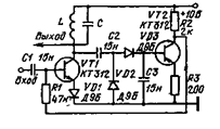 Усилитель промежуточной частоты на микросхемах К122УС2Б. Схема УПЧ (рис. 4.92) содержит два резонансных каскада усиления, детектор и УПТ цепи АРУ. Чувствительность схемы 10 мкВ. Напряжение шума, приведенное ко входу, 1 мкВ. Полоса пропускания 15 кГц. Схема АРУ обеспечивает изменение выходного сигнала на 6 дБ при изменении входного сигнала на 46 дБ. Усилитель с регулируемой полосой пропускания. Усилитель построен на ОУ типа К140УД1Б (рис. 4.93), в цепь ООС которого включен контур. Часть выходного сигнала с делителя R2, R3 подается на неинвертирующий вход ОУ. На резонансной частоте контура без ПОС усиление каскада будет определяться выражением Kу u = wL/R1 — l/wCR1. При введении ПОС усиление каскада увеличивается, а полоса пропускания усилителя сужается, т. е. увеличивается эквивалентная добротность контура. Усилитель имеет низкое полное выходное сопротивление, что упрощает согласование его с последующими устройствами. Верхняя граничная частота использования схемы определяется частотными свойствами ОУ. Логарифмический усилитель. Усилитель (рис. 4.94) состоит из транзистора VT1, колебательного контура, настроенного на частоту 100 кГц, схемы детектирования, включающей конденсаторы С2, СЗ, диоды VD2, VD3 и УПТ на транзисторе VT2. Последний управляет базовым током транзистора VT1, что приводит к изменению коэффициента усиления каскада. При увеличении амплитуды входного сигнала, когда напряжение на конденсаторе СЗ оказывается достаточным для открывания транзистора VT2, напряжение на его коллекторе будет уменьшаться, что приведет к уменьшению коэффициента передачи транзистора VT1. В результате амплитудная характеристика близка к логарифмической. Максимальный коэффициент усиления схемы около 100.