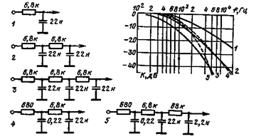 Пассивные RC-фильтры. Пассивные фильтры низких частот строятся на RС-элементах. Частота среза одиночного фильтра определяется выражением fср = 160/RС, где fср — в килогерцах, R — в омах, С — в микрофарадах. Для увеличения крутизны спада АЧХ используется последовательное соединение нескольких RС-фильтров. В такой схеме звенья имеют равные постоянные времени, однако номиналы R и С могут отличаться. Применяется в основном принцип увеличения номинала сопротивления. Схемы пассивных ФНЧ на RС-элементах и их АЧХ приведены на рис 5 1 Динамический фильтр. Полоса пропускания динамического фильтра (рис. 5.2) меняется в зависимости от амплитуды входного сигнала. Это достигается изменением сопротивления полевого транзистора при управлении по затвору входным сигналом, преобразованным цепочкой VD1, CL На фильтр сигнал подается с потенциометра RI. Для получения малых нелинейных искажений амплитуда входного сигнала фильтра должна быть не более 100 мВ.