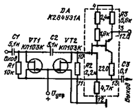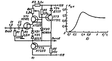 Корректирующий фильтр. Фильтр высоких частот (рис. 5.20, а) имеет частоту среза 1 кГц. Подавление сигналов с частотами ниже 1 кГц происходит за счет ООС, которая осуществляется через транзистор VT1. Глубина этой связи тем больше, чем больше амплитуда сигнала на конденсаторе С2. Частотную характеристику фильтра можно менять, подключая в эмиттер транзистора VT2 конденсатор СЗ. С этим конденсатором возникает подъем характеристики на частотах выше 5 кГц. При подключении этого конденсатора в коллектор транзистора VT2 возникает завал на частотах выше 5 кГц. На рис. 5.20, б приведена АЧХ фильтра для двух значений емкости СЗ.