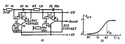 Двухкаскадный фильтр. Фильтр высоких частот на интегральной микросхеме К284УД2 (рис. 5.17, а) имеет частоту среза 80 Гц. Уходы частоты среза в диапазоне температур от +25 до +80° С составляют 0,2%. Форма АЧХ проиллюстрирована на рис. 5.17,6.