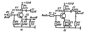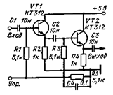 В контуре должны возникнуть затухающие колебания. Однако этого не происходит. При работе эмнттерного повторителя на емкостную нагрузку с индуктивным сопротивлением в цепи базы в схеме возникают колебания. Емкость нагрузки, при которой начинает возбуждаться эмиттерный повторитель, определяется выражением Сн = тк/h21Э R6, где тк — постоянная времени транзистора с ОЭ; h21Э — коэффициент передачи тока в схеме с ОЭ. В результате на выходе существуют незатухающие колебания. Для устранения возбуждения колебаний, когда транзистор VT1 открыт, в схему введен резистор R3. Амплитуда гармонического сигнала с частотой 10 МГц на нагрузке с емкостью до 2 нФ составляет 5 В, а амплитуда сигнала с частотой 6 МГц на нагрузке с емкостью до 3,5 нФ равна 10 В Длительность управляющих сигналов от 0,1 икс до десятков миллисекунд.