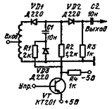 Транзисторный выключатель. Устройство (рис 721) предназначено для дистанционного включения переменного сигнала при отрицательном управляющем сигнале 1 В входной сигнал с амплитудой менее 1 В не проходит через транзисторы VT1 и VT2 Ослаб ление входного сигнала может превышать 100 дБ на частотах до 10 МГц. Для открывания схемы на управляющий вход подается напряжение положительной полярности 2 — 3 В. В этом режиме оба транзистора открыты. Коэффициент усиления схемы равен 09 Диодный выключатель. При отсутствии сигнала на управляющем входе (рис. 7.22) транзистор VT2 закрыт. Положительное коллекторное напряжение закрывает диоды VD1 и VD2 Положительное напряжение на управляющем входе открывает транзистор VT2 и на его коллекторе появляется напряжение минус 4 В которое откроет диоды. Входной сигнал с амплитудой 0,5 В, через диоды пройдет на выходы. Частота входного сигнала 100 МГц Диодный выключатель может работать в широком диапазоне частот Для уменьшения нижней граничной частоты входного сигнала необходимо увеличить емкости конденсаторов. При входном сигнале с амплитудой более 1 В выходной сигнал имеет нелинейные искажения Диодный высокочастотный выключатель. Импульсный модулятор высокочастотного сигнала (рис. 7.23) представляет собой диодный переключатель. Когда управляющий транзистор закрыт отрицательное напряжение на его коллекторе закрывает диоды V D1 и VD2 и открывает диод VD3. Конденсатор С1 ослабляет входной сигнал, который проходит через закрытый диод VD1. В результате этого общее ослабление на выходе схемы составит более 70 дБ. При открывании транзистора VT1 положительное напряжение открывает диоды VD1 и VD2 и закрывает диод VD3. Входной сигнал через диоды поступает на выход. Схема может управлять сигналами с частотой до 30 МГц. Скорость переключения может составлять 500 кГц.