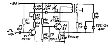 Генератор радиоимпульсов. Генератор (рнс. 7.24) построен на одном транзисторе, включенном с ОБ. Коэффициент трансформации в пределах 0,3 — 0,15 не критичен. При запуске схемы на управляющий вход поступает положительный импульс с амплитудой до 5 В. Цепочка R2, С2 создает автоматическое смещение. Для трансформатора с обмотками (w1=25 витков, w2 = Q витков, w3 = 2 витка), намотанными на каркасе диаметром 7 мм, частота гармонического сигнала равна 20 — 30 МГц. Колебания нарастают за 2 — 3 периода. Длительность спада радиоимпульса определяется сопротивлением резистора R1. Для R1 — 1 кОм затухание происходит за 2 — 3 периода. Если применить транзистор ГТ313, можно получить колебания с частотой 100 — 150 МГц; при этом трансформатор должен иметь обмотки (w1=4,5 витка; w2=1 виток) на каркасе диаметром 7 мм, R2 = 91 Ом; С2=18 пФ. Нарастание колебаний происходит за 5 — 7 периодов.