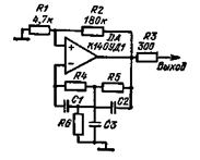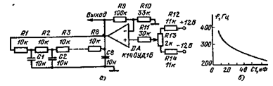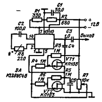 Генератор с низкочастотной линией. В основу генератора (рис 927, а) положена длинная- фазосдвигаюшая цепь Колебания в схеме возникают за счет большого коэффициента усиления ОУ На выходе ОУ формируется сигнал прямоугольной формы По мере продвижения сигнала по RC цепям форма его меняется Если на конденсаторе С1 он имеет форму, трапеции, в последующих цепях треугольную, то на оконечных — гармоническую форму Высшие спектральные составляющие прямоугольного сигнала отфильтровы ваются Степень ослабления этих гармонических составляющих зависит от количества RC звеньев На выходе схемы присутствует гармонический сигнал, амплитуда которого практически не меняется при изменении емкости конденсатора С1, определяющего частоту сигнала (см график рис 9 27, б) Управляемый генератор на интегральной микросхеме К226УС4Б. Фазосдвигающая цепочка генератора (рис 9 28) состоит из конденсаторов С4 и С5 и сопротивлений полевых транзисторов VT1 и VT2 Частота генерации Определяется выражением w = (U0 — U3)/RTCU0, где Rr — сопротивление полевого транзистора при напряжении на затворе, равном нулю, U0 — напряжение отсечки полевого транзистора; U3 — управляющее напряжение в затворе. Эта формула справедлива при условии, что характеристики полевых транзисторов близки друг другу. Для уменьшения нелинейных искажений генерируемых колебаний применяется ОС, осуществляемая через резисторы R3 — R6, которая выравнивает зависимость сопротивления полевого транзистора от напряжения в затворе Кроме того в схему введена еще одна цепь ООС, влияющая на форму колебаний. Эта связь выполнена на терморезисторе R8.