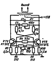 С помощью полевых транзисторов можно перестраивать частоту генератора почти в 100 раз. Однако на краях диапазона наблюдается значительное искажение формы колебаний. Двухтактный генератор. Генератор (рис. 9 29) собран по двухтактной схеме В коллекторы транзисторов включен колебательный контур. При заданной индуктивности частота выходного сигнала может меняться дискретно подключением конденсаторов. Резистор R1 позволяет точно настраиваться на фиксированные частоты Обратная связь осуществляется через резисторы R2 и R3. Амплитуду выходного сигнала можно регулировать с помощью резистора R8 Для установки частоты генератора с помощью С1, С2 можно пользоваться данными, приведенными в табл. 9.1. Таблица 9.1