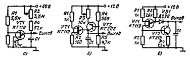 На рис. 11.2, в изображена схема генератора, на выходе которого формируется спадающее пилообразное напряжение. Заряд конденсатора С1 осуществляется через резистор R3 и диод VD1. Транзисторы VT1 и VT2 в это время закрыты. При определенном напряжении на конденсаторе открывается транзистор VT1 и закрывается диод. На резисторе R 2 появляется напряжение, которое открывает транзистор VT2. Через этот транзистор начинает протекать ток, который линейно разряжает конденсатор. Напряжение на конденсаторе падает. К концу разряда диод открывается, ток эмиттера транзистора VT1 уменьшается и рабочая точка, расположенная на падающем участке вольт-амперной характеристики, становится нестабильной. Это вызывает регенеративный процесс уменьшения тока и быстрое выключение транзистора. После этого процесс повторяется. Если вместо резистора R3 на рис. 11.2, в поставить генератор тока, как показано на рис. 11.2,6, то можно получить выходной сигнал треугольной формы. В этой схеме заряд и разряд конденсатора осуществляется генераторами тока. Плавно меняя зарядные и разрядные токи с помощью резисторов R3 и R4, можно менять фронт сигнала. Генераторы на лавинных транзисторах. Для получения сигналов пилообразной или треугольной формы можно применять схемы, в которых управляющим элементом является транзистор, работающий в режиме лавинного пробоя. В схемах на рис. 11.3 применены транзисторы интегральной микросхемы К.101КТ1А. На рис. 11.3.а приведена схема генератора сигнала треугольной формы. В этой схеме транзисторы используются в инверсном включении. На выходе формируется сигнал с амплитудой 4 — 5 В и частотой 7 кГц. Другая схема, рис. 11.3, б, используют нормальное включение транзисторов. Амплитуда выходного сигнала может доходить до 60 В при частоте 100 кГц. В этих схемах происходит поочеред ное включение транзисторов. Конденсатор поочередно заряжается через резисторы R1 и R2. Высокая идентичность параметров транзисторов позволяет получить хорошую симметрию треугольного сигнала.