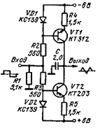 Генератор сигнала треугольной формы на ОУ. В схеме рис. 11.11 на конденсаторе С формируется сигнал треугольной формы с амплитудой 0,6 В. Заряд и разряд конденсатора осуществляются выходным сигналом ОУ, который автоматически меняется в тот момент, когда напряжение на конденсаторе достигает порога открывания. Порог открывания устанавливается делителем R2 и R3. Частота следования выходного сигнала определяется выражением f=l/4R1C. Для выравнивания наклонов фронта и спада выходного сигнала служит резистор R6. Формирователь треугольного сигнала. Формирователь рис. 11.12 позволяет получить на выходе сигнал треугольной формы. Амплитуда сигнала достигает 90% напряжения питания при достаточно высокой линейности фронтов. В основу формирователя положен принцип заряда и разряда конденсатора через генераторы тока, построенные на транзисторах. Коллекторные токи транзисторов определяются опорными напряжениями стабилитронов и эмиттерными резисторами. При отсутствии входного сигнала через транзисторы должны протекать равные токи. Если равенство токов не выполняется из-за разброса номиналов стабилитронов и резисторов, то следует подстроить резистор R4. Появление входного сигнала с амплитудой больше напряжения пробоя стабилитронов вызовет разбаланс коллекторных токов. Положительная полуволна входного сигнала уменьшит ток транзистора VT2. Ток транзистора VT1 останется без изменения. Разностный коллекторный ток будет заряжать конденсатор. С приходом отрицательной полуволны уменьшится коллекторный ток транзистора VT1. Ток транзистора VT2 установится номинальным. Конденсатор будет разряжаться током транзистора VT2. Если амплитуда входного сигнала меньше напряжения питания, то наблюдается прямая зависимость между амплитудами входного и выходного сигналов, а если больше напряжения питания, то амплитуда выходного сигнала постоянна. Емкость конденсатора рассчитывается по формуле С= 103I/2fUmах (мкФ), где I — ток транзистора; f — частота входного сигнала; Umax — амплитуда выходного сигнала.
