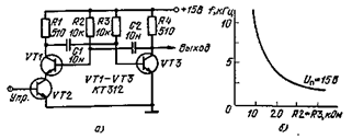 Расширитель импульсов с динамическим порогом. Входной сигнал (рис. 12.15) с помощью транзистора VT1 сбрасывает заряд конденсатора С1. Транзисторы VT2 — VT4 находятся в закрытом состоянии. Псспе действия входного сигнала конденсатор С1 начинает заряжаться через резистор R2. Когда напряжение на конденсаторе увеличится до 4 В, откроется стабилитрон VD1. Дальнейшее увеличение напряжения на конденсаторе приведет к открыванию транзистора VT2. Это произойдет, когда напряжение на базе будет 7 В. Порог открывания транзистора VT2 задается делителем R5, R6. С открыванием транзистора VT2 начнет проводить транзистор VT4. Коллекторный ток этого транзистора откроет транзистор VT3, который уменьшит порог открывания. Произойдет релаксационный процесс. В результате на выходе схемы будет положительный сигнал +20 В. В таком состоянии схема находится до прихода следующего входного импульса амплитудой 5 В и длительностью 0,5 мс. Длительность выходного сигнала определяется постоянной времени R2Ct, она может достигать значений 5 с. Управляемый мультивибратор. Генератор (рис. 12.16, а) управляется внешним сигналом положительной полярности. Когда приходит управляющий сигнал, мультивибратор формирует сигнал прямоугольной формы скважностью 2. Частота колебаний не зависит от питающего напряжения при Е = 3 В. Фаза импульсного сигнала привязана к фронту управляющего сигнала. Частоту выходного сигнала можно менять при изменении сопротивления резисторов R2 и R3 (рис. 12.16, б).