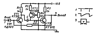 С приходом входного сигнала положительной полярности амплитудой более 2 В и длительностью 10 мкс конденсатор С1 разряжается через транзистор VT3. После этого начинается процесс заряда конденсатора постоянным током. Напряжение на конденсаторе меняется по линейному закону U=(I/C)t. Ток заряда определяется опорным напряжением стабилитрона VD1 и сопротивлением резистора R2. Во время заряда конденсатора транзистор VT2 открыт. Максимальная длительность выходного импульса определяется выражением тmах= (Е — Uo)C/I, где E=10 В; Uo = 6B — опорное напряжение стабилитрона. На рис. 12.12,6 приведена зависимость длительности выходного импульса от сопротивления резистора R2. Расширитель импульсов на интеграторе. В основу генератора (рис. 12.13, а) положен интегратор, собранный на транзисторе VT2 и цепочке R2, С1. Постоянная времени интегратора h21Э=R2C1, где hzi э — коэффициент передачи тока транзистора VT2. После прекращения действия входного импульса амплитудой более 2 В и длительностью 10 мкс конденсатор С1 начинает заряжаться через резистор R2. Напряжение на коллекторе транзистора VT2 плавно нарастает. Когда это напряжение достигнет опорного напряжения стабилитрона VD1, открывается транзистор VT3. Обратная связь через конденсатор С2 ускоряет открывание транзистора VT3. При увеличении номиналов, элементов R2 и С1 можно получить задержку включения транзистора VT3 до нескольких минут. На рис. 12.13,6 приведен график зависимости длительности выходного импульса от R2. Расширитель импульсов на зарядном конденсаторе. Конденсатор С1 в схеме рис. 12.14, а разряжается через транзистор VT1 входным импульсом. После этого происходит процесс заряда конденсатора через резистор R2. Когда напряжение на конденсаторе достигнет 9 В, открывается транзистор VT2, а следом за ним открывается и транзистор VT3. Для разряда конденсатора С1 входной сигнал должен иметь амплитуду более 2 В и длительностью 10 мкс. Работа схемы проиллюстрирована на рис. 12.14,6.