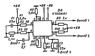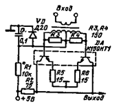 Удвоитель на составном каскаде. Устройство (рис. 14.18) собрано на двух транзисторах разной проводимости. В исходном состоянии оба транзистора закрыты. На входе действует сигнал гармонической формы. Положительная полярность входного сигнала открывает транзистор VT1 и закрывает транзистор VT2. Протекающий ток транзистора VT1 создает падение напряжения на резисторах R3 и R4. На первом выходе будет сигнал, совпадающий по фазе с входным сигналом, а на втором выходе сигнал будет находиться в противофазе. При равенстве сопротивлений резисторов R3 и R4 амплитуды этих сигналов будут равны. Отрицательная полуволна входного сигнала закроет транзистор VT1 и откроет транзистор VT2. На Выходе 1 появится сигнал, находящийся в противофазе с входным сигналом, а на Выходе 2 — будет совпадать по фазе с входным сигналом. Таким образом, при подаче на вход синусоидального сигнала на Выходе 1 все полуволны будут положительными, а на Выходе 2 — отрицательными. Удвоитель работает в диапазоне частот от 200 Гц до 20 кГц.