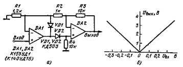 Компенсационный преобразователь абсолютных значений. Формирование абсолютного значения входного сигнала в схеме (рис. 15.10, а) осуществляется при взаимодействии входного и выходного сигналов. Если на входе присутствует сигнал положительной полярности, то выходной сигнал формируется за счет прохождения входного сигнала по цепи Rl — R4. Для входного сигнала отрицательной полярности на выходе интегральной микросхемы формируется сигнал положительной полярности, который проходит через диод VD1 на резисторы R4, R2, R1. В результате на выходе образуется разностный сигнал. Поскольку сопротивление резистора R1 в два раза больше сопротивления резистора R4, сигнал микросхемы на выходе является преобладающим. С помощью резистора R2 можно балансировать схему. На рис. 15.10, б приведено семейство переходных характеристик преобразователя. Детекторный преобразователь. Формирователь абсолютного значения входного сигнала (рис. 15.11, а) построен по принципу двух-полупериодного выпрямления на диодах VD1 и VD2. Положительное значение выходного сигнала ОУ DA1 проходит через диод и поступает на неинвертирующий вход ОУ DA2. На выходе будет положительный сигнал. Отрицательное значение выходного сигнала ОУ DA1 проходит на инвертирующий вход ОУ DA2. На выходе также будет положительный сигнал. Для положительного входного сигнала коэффициент передачи равен K+ = R6R4/R5R1. а для отрицательного —