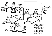 Последовательная схема преобразователя. На ОУ DA1 в составе преобразователя (рис. 15.15) построен двухполупериодный детектор. В этой микросхеме происходит разделение полярностей входного сигнала. Сигнал с отрицательной полярностью проходит на инвертирующий вход усилителя DA2. На выходе этого усилителя сигналы объединяются на резисторе R11. С помощью резистора R11 добиваются равенства частей выходного сигнала, соответствующих положительной и отрицательной полярностям входного сигнала. Порог разделения входного сигнала можно регулировать в ОУ DA1 с помощью резистора R6. Входной сигнал с частотой от О до 5 кГц и с амплитудой от 1 мВ до С В передается на выход с нелинейностью менее 0,2 %.