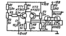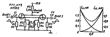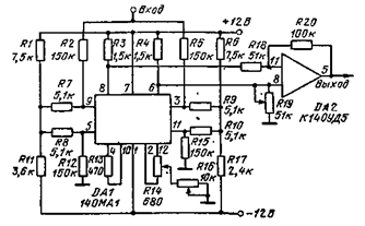 Дифференциальная схема квадратора. Возведение сигнала в квадрат (рис. 15 19) осуществляется с помощью полевых транзисторов. Интегральная микросхема типа К122УД1 служит для установки рабочего режима полевых транзисторов и усиления сигнала. Из-за разброса напряжений отсечки полевых транзисторов им требуются разные положительные потенциалы на затворе. Регулировка этих напряжений осуществляется резистором R2, а общий уровень сигнала для обоих транзисторов регулируется резистором R3.