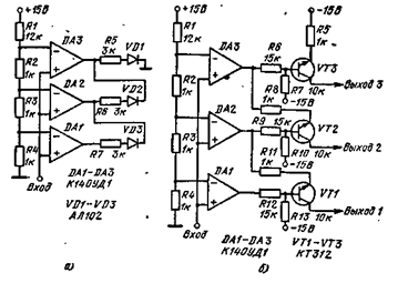 Пороговый преобразователь входного сигнала. Схема (рис. 15.46, а) осуществляет поочередное включение светодиодов, подсоединенных к выходам ОУ. Диоды включены таким образом, что при включении последующего диода выключается предыдущий. Это достигается тем, что пороги- открывания ОУ различны: у усилителя DA1 минимальный порог, а у усилителя DA3 — максимальный. У всех закрытых ОУ выходные напряжения имеют минусовое значение. С включением первого усилителя через первый светоднод протекает ток, он светится. Когда включается второй усилитель, загорается второй светодиод, а первый выключается, поскольку выходные напряжения первых двух усилителей будут равны.