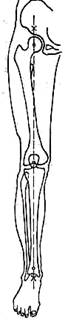 Рис. 29. Ось ноги проходит при выправленной ноге через головку бедра, середину коленной чашки, середину лодыжсчной вилки