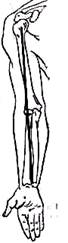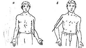 Рис. 33. Деформация руки: а - cubitus valgus, ось плеча проходит днстально внутри от головки локтевой кости; 6 — cuhitus varus, ось плеча располагается снаружи от головки локтевой кости. в противоположные стороны в виде genu valgum на одной ноге и genu varum на другой (см. рис. 31). б). В искривлениях отдельных сегментов конечности на протяжении в пределах метафизов и диафизов (crus varum, valgum; humerus varus; femur varum, valgum; antibrachium varum, valgum и т. д.). Нарушение взаимоотношения суставных концов. По характеру и степени изменений различают: а) недоразвитие суставов, или дисплазии (dyspasia), при которых между сочленяющимися концами сохраняются правильные взаимоотношения, но суставные поверхности вследствие недоразвития одного или обоих суставных концов лишены нормального контакта, б) неполные вывихи, или подвывихи (subluxatio), при которых смещенные суставные концы сохраняют частичное соприкосновение, правильное же взаимоотношение суставных поверхностей нарушено и в) вывихи (luxatio), для которых характерна полная потеря соприкосновения сочленяющихся концов. По общепринятым правилам вывихи и подвывихи получают название по периферической части скелета: например, при переломо-вывихе в голеностопном суставе с типичным смещением говорят о травматической отведенной стопе (pes valgus), при вывихе в тазобедренном суставе — о вывихе бедра, при вывихе в локтевом суставе — о вывихе предплечья. Исключения составляют вывихи позвонков и ключиц, при которых говорят непосредственно о вывихнутом сегменте, например вывих грудинного (или акромиального) конца ключицы (luxatio claviculae sternalis, acromialis) (Бабич, 1951). Установление факта подвывиха или вывиха говорит только об определенных анатомических изменениях в исследуемом суставе и о степени смещения суставных поверхностей. Дальнейшее исследование больного требует последовательного выяснения ряда вопросов. Прежде всего необходимо установить, является ли вывих (подвывих) врожденным или приобретенным. Приобретенные вывихи подразделяют по причине их возникновения, а следовательно, и по характеру изменений на вывихи (подвывихи) травматические, патологические и паралитические. Различают также рецидивирующие—привычные вывихи (luxatio habitualis), в основе которых в одних случаях лежит травматический генез, в других — нарушение мышечного тонуса или нормального развития и роста конечности. При травматических вывихах смещение суставных концов сопровождается большим или меньшим разрывом капсулы сустава, связочного аппарата и нарушением мышечного синергизма, создающими типичный симптомокомплекс травматического вывиха, выявляемый часто одним осмотром. В некоторых случаях, особенно при вывихах-переломах, типичный симптомокомплекс травматического вывиха может быть слабо выражен, замаскирован сопутствующим повреждением кости. Исследуя травматические вывихи, необходимо выяснить месторасположения вывихнутого конца, иначе говоря, вид травматического вывиха. По направлению смещения вывихнутого суставного конца вывихи могут быть передними, задними, верхними, нижними и т. д. Для ориентации при определении направления смещения служит суставный конец проксимального сегмента, положение которого считается (в некоторых случаях условно) неизменным. По отношению к нему травматические вывихи обозначают как задний вывих предплечья, задне-наружный вывих предплечья, задне-в