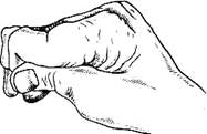 Давление в месте повреждения вызывает ограниченную болезненность. При таких разрывах сухожилие разгибателя отрывается иногда с кусочком кости. В запущенных случаяхногтеваяфаланга устанавливается в положение сгибания. С течением времени сгибательное положение ногтевой фаланги делается стойким: в концевом суставе пальца развивается миоартрогенная контрактура. При подозрении на повреждение сухожилий сгибателей пальцев следует провести изолированное исследование функции межкостных и червеобразных мышц, поверхностного и глубокого сгибателей пальцев. Если больной в состоянии согнуть пальцы только в пястно-фаланговых сочленениях, а движения в суставах пальцев полностью отсутствуют, то это означает, что межкостные и червеобразные мышцы целы, а повреждены оба сгибателя — поверхностный и глубокий (рис. 307).При повреждении глубокого сгибателя невозможно сгибание концевой фаланги соответствующего пальца. Если глубокий сгибатель сохранен, а выпала функция поверхностного сгибателя пальца, больной в состоянии согнуть палец во всех своих суставах. Это сгибание происходит следующим образом: вначале полностью сгибается ногтевая фаланга, затем начинает сгибаться средняя фаланга поврежденного пальца. При отсутствии повреждения сухожилий сгибание пальцев совершается одновременно во всех суставах. При патологически удлиненных дистальных отделах конечностей, наблюдаемых при синдроме Marian (арахнодактилии), иногда довольно трудно выявить относительное удлинение пальцев. Для этой цели удобно воспользоваться очень простым остроумным приемом. Больному предлагают захватить пальцами правой руки большой палец своей левой руки, зажав его в кулаке. В нормальных условиях кончик большого пальца полностью скрывается в кулаке. При арахнодактилии кончик большого пальца, зажатого в кулаке, заметно выдается над внутренним краем кисти. В том, что конечности не пропорционально удлинены, можно убедиться, если больной разведет руки в стороны — размах рук превышает рост больного. Контрактуру собственных мышц кисти, червеобразных и межкостных, определяют следующим образом Сгибают полностью пассивно пястно-фаланговые суставы для того, чтобы расслабить напряжение исследуемых мышц. При таком положении пястно-фалантовых суставов делаются возможными пассивные движения пальцев в межфаланговых суставах. Если же пястно-фаланговые суставы установить в положении разгибания, напрягающего собственные мышцы кисти, то сгибание в межфаланговых суставах при контрактуре собственных мышц кисти становится невозможным. Стойкие сгибательные установки в суставах пальцев могут быть обусловлены сращением сухожилий длинных сгибателей с их влагалищами (тендогенная контрактура) или рубцовыми изменениями и контрактурой длинных сгибателей пальцев в области мышечного брюшка (миогенная контрактура). Для того чтобы определить, которая из названных причин обусловливает стойкое согнутое положение пальцев, пользуются следующим приемом. Сгибают луче-запястный сустав, надавливая на кончик пораженного пальца, стараются разогнуть его. Если палец согнут в результате изменений мышечного брюшка, то при согнутом луче-запястном суставе палец можно по крайней мере немного разогнуть. Сращение сухожилия с его влагалищем делает при таких же условиях пассивное ра