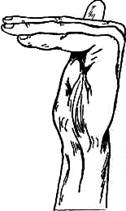большого пальца Продольный свод кисти активно не может быть изменен. Атрофия коротких мышц кисти, особенно thenar и hypothenar, ведет к уплощению ладонной ямки из за понижения образуемых ими на краях ладонной ямки возвышений, а также из-за потери возможности актирного увеличения поперечного свода кисти. Нарушение нормальной формы ладонной ямки может проявляться либо в большем ее углублении, либо, наоборот, в уплощении. Углубление ладонной ямки мало нарушает функцию кисти. Деформация кисти в виде уплощения ладонной ямки неблагоприятна с функциональной точки зрения. Нормальная форма кисти может нарушаться при переломах пястчых костей со смещением отломков к тылу или в ладонную сторону. Смещение отломков вбок во фронтальной плоскости и по длине укорачивает кисть, не нарушая ладонной ямки. Краевые переломы основания первой пястной кости с типичным смещением дистального отломка в сторону его приведения ограничивают возможность углубления ладонной ямки из-за невозможности отвести и противопоставить большой палец. Изменяется форма кисти при мышечной атрофии. Уплощение возвышения, образованного мышцами thenar, наблюдается наряду с другими признаками при повреждении срединного нерва. При повреждении локтевого нерва уплощается hypothenar и углубляются межкостные промежутки кисти. При атрофии мелких мышц кисти (червеобразных и межкостных) возникает так называемая «полая» кисть (manus excavata); она отражает форму пястных костей, образующих продольный свод кисти, маскируемый в неизмененной кисти окружающими мышцами. Изменения формы кисти, обусловленные мышечными атрофиямн, вызываются травматическими, инфекционными, токсическими невритами или миелитом. Больные с «концевыми» мышечными атрофиями нуждаются специальном неврологическом исследовании. Осмотр кисти проводится с тыльной и ладонной ее поверхностей Переломы пястных костей со смещением отломков под углом, открытым в ладонную сторону, обнаруживают при осмотре углубления укороченной ладонной ямки и выступающие вершины углового искривления на тыле кисти. Такие же переломы, но со смещением отломков под углом, открытым в тыльную сторону, приводят к исчезновению ладонной ямки, которая оказывается выполненной отломками кости. При осмотре кисти со стороны головок пястных костей можно определить, которая из пястных костей сломана головка сломанной пястной кости при смешении отломков оказывается опущенной. Острые воспалительные процессы кисти сопровождаются значительной припухлостью тыльной ее поверхности. Отек кисти на тыльной поверхности развивается не только при воспалительных процессах на тыле кисти, но также при наличии воспалительного фокуса на ладонной поверхности кисти и пальцев. Эта типичная отечность часто служит источником ошибок в диагностике локализации фокуса. Причина отечности тыла кистипри воспалительном фокусе на ее волярной поверхности заключается в том, что мощный апоневроз ладони (aponeurosis palmans) даже при значительной отечности препятствует появлению припухлости на ладонной поверхности кисти. Ощупывание области пясти обнаруживает при переломах пястных костей местную болезненность в зоне повреждения. Пальпацией легко определяется направление, в котором произошло смещение отломков. При неблагоприятном смещении отломков переломанной пястной кости под у