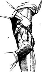 Рнс 417. Ощупывание при переломе надколенника, расхождение фрагментов — палец можно погрузить между отломками.