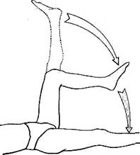 Рис 420 Признак привычного вывиха надколенника. Активное сгибание в коленном суставе разогнутой ноги совершается до прямого угла (белая стрелка), после чего надколенник вывихивается и голень падает (затемненная стрелка).