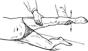 Рис 419 Проба МсМиггеу для распознавания разрыва мениска Безболезненное щелкание с наружной стороны колена встречается иногда в нормальном суставе, а также при сплошном наружном мениске, но в этих случаях оно происходит при активных движениях. Причины, лежащие вне коленного сустава, также иногда могут обусловить щелкание в области колена. Такими причинами является соскальзывание сухожилий над костными выступами (полусухожильной мышцы над внутренним мыщелком бедра, сухожилия двуглавой над головкой малой берцовой кости, tractus iliotibialis над наружным мыщелком бедра). Исследовать всегда нужно оба, правый и левый, сустава в одинаковых условиях. Хронические артриты дают иногда при движениях в суставе шумы, имеющие характер хруста или скрипа, резче всего выраженные в момет конечных движений сгибания и разгибания. При хондроматозе прослушиваются множественные резкие звуки высокого тона, напоминающие прерывистый треск. Расстройства движений. Перед исследованием активных движений в коленном суставе следует предложить больному, лежащему с разогнутыми коленными суставами, напрячь мышцы бедра. При таком мышечном напряжении делаются хорошо видимыми передние мышцы бедра, а при сравнительном осмотре легко обнаруживается мышечная атрофия. Атрофия мышц наблюдается во всех случаях повреждений коленного сустава. Она бывает рефлекторного типа и вовлекает преимущественно четырехглавую мышцу бедра, особенно ее внутреннюю часть (vastus medialis), обнаруживаемую по уплощению рельефа внутренней части мышцы. При выпоте в полость сустава ограничивается возможность полного активного сгибания в коленном суставе. Ограничение сгибания объясняется в этих случаях давлением жидкости на передний сумочный аппарат. Активное разгибание иногда ограничивается ущемлением гипертрофированных жировых тел. Активные движения в коленном суставе резко нарушаются при хронических воспалительных его заболеваниях, сопровождающихся деструкцией суставных концов. При капсульной флегмоне коленного сустава, возникшей в результате острого гнойного артрита, делаются невозможными ни активные, ни пассивные движения; попытка определить подвижность в суставе вызывает мучительные боли.