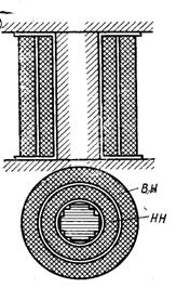 магнитопровода 2. В действительности каждая обмотка размещается на обоих стержнях так, что половины двух обмоток находятся на левом, а вторые половины — на правом стержне магнитопровода. При таком расположении обмоток достигается лучшая магнитная связь между ними, благодаря чему снижаются потоки рассеяния, которые не участвуют в процессе трансформирования энергии. Действие трансформатора основано на явлении взаимной индукции. Если первичную обмотку 1трансформатора включить в сеть источника переменного тока, то по ней будет протекать переменный ток В целях улучшения магнитной связи между первичной и вторичной обмотками их помещают на стальном магнитопроводе. Обмотки изолируют как друг от друга, так и от магнитопровода. Обмотку более высокого напряжения называют обмоткой высшего напряжения(ВН), а обмотку более низкого напряжения — обмоткойнизшего напряжения(НН). Обмотку, включенную в сеть источника электрической энергии, называют первичной;обмотку, от которой энергия подается к приемнику,— вторичной.Обычно напряжения первичной и вторичной обмоток неодинаковы. Если первичное напряжение меньше вторичного, трансформатор называют повышающим, если же первичное напряжение больше вторичного — понижающим. Любой трансформатор может быть использован и как повышающий и как понижающий. Повышающие трансформаторы применяют для передачи электроэнергии на большие расстояния, а понижающие - для распределения электроэнергии между потребителями. В трехобмоточных трансформаторах на сердечнике помещают три изолированные друг от друга обмотки. Такой трансформатор дает возможность получить два различных напряжения и снабжать электрической энергией две различные группы приемников. Помимо обмоток ВН и НН трехобмоточный трансформатор имеет обмотку среднего напряжения(СН). Обмоткам трансформатора придают преимущественно цилиндрическую форму, выполняя их при малых токах из круглого медного изолированного провода, а при больших токах из медных шин прямоугольного поперечного сечения. Ближе к сердечнику располагают обмотку НН, так как ее легче изолировать от него, чем обмотку ВН. Расположение обмоток на сердечнике трансформатора показано на рисунке 6.2. Обмотку НН изолируют от сердечника прослойкой из какого-либо изоляционного материала. Такая же изолирующая прокладка имеется между обмотками ВН и НН.