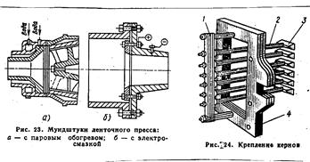 Рис.20-24. 1 - Планка. 2 - Стержень. 3 - Керн. 4 - Мундштук. Головка преса – це зв’язуючи ланка між корпусом і мундштуком і служить для ущільнення і гомогенізації (надання однорідності масі). В головці вирівнюється швидкість і тиски, а також забезпечується плавний перехід струму маси від круглого перетину до форми виробу. Площа вихідного отвору головки в 2…2,5 рази менша ніж на вході. Для вирівнювання швидкості в перетині струму до головки кріплять металеві пластини – гальма. Частина внутрішньої поверхні може бути рифлена. Пресові головки можуть бути одно- або двомундштучні. Для зменшення тертя об стінки головки впроваджують паровий підігрів або подачу води в головку. Для виготовлення пустотілих виробів вилучають змінну вставку і встановлюють керн.
