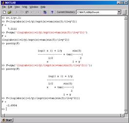 Рис. 5 Далее команда pretty(F) выводит в командное окно символьное выражение F в виде, близком к математической формуле. Выведенная и исходная формулы не совпадают. Предполагаемая ошибка ввода – знаменатель исходной дроби не заключен в скобки. В пятой командной строке редактируется третья команда (<↑↑>) для устранения ошибки ввода. Затем команда pretty(F) отображает в командном окне исправленное выражение. Теперь выведенная формула совпадает с исходной. В седьмой командной строке редактируется пятая команда (<↑↑>) для придания исправленному символьному выражению статуса арифметического. Седьмая команда вычисляет правильный результат F = - 2,6904. Иногда появляется совершенно неожиданный или явно неправильный результат. Так, если вы попытаетесь вычислить при x = -8, набирая >> x=-8;r=x^(1/3) r = 1.0000 + 1.7321i ответ, который система MATLAB создает, не похож на ожидаемый результат -2. Тем не менее, полученный результат является кубическим корнем из -8, что подтверждается возведением этого результата в куб: >> r^3 ans = -8.0000 + 0.0000i Дело в том, что многозначная функция имеет в комплексной плоскости три ветви, а уравнение x3 = -8 – три разных значения корня: >> solve('x^3=-8') ans = [ -2] [ 1-i*3^(1/2)] [ 1+i*3^(1/2)] Система MATLAB воспринимает для отрицательного x как значение
