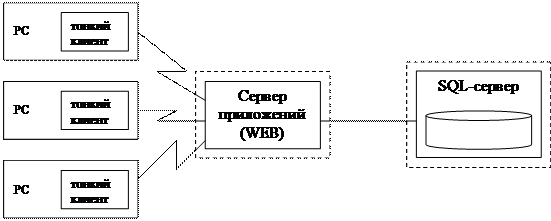 Рис.4.Многозвенная архитектура. При такой архитектуре персональные компьютеры взаимодействуют с сервером приложений через тонкий клиент. Когда тонкому клиенту, работающему на ПК, требуется получить данные из совместно используемого файла, сервер приложений автоматически считывает требуемый блок данных с SQL-сервера и, преобразуя их в формат HTML, выдает тонкому клиенту. Данная архитектура является гибридной. Тонкий клиент позволяет в стандартном формате работать с любыми данными. Сервер приложений является инструментом для отображения данных в формате HTML. Эта архитектура применяется в таких сетях, как Internet (всемирная сеть), Intranet (внутренняя сеть). В сервере приложений запускается столько копий приложений, сколько пользователей требует информацию. Широко применяется программное обеспечение для серверов приложений, называемое Apache. Преимущества: удобство и гибкость (при замене модификации приложения достаточно заменить его только на сервере приложений), невысокие требования для клиентского компьютера. Недостатки: ограничение возможностей, тонкий клиент имеет ограниченные возможности. Сетевая модель организована на принципе соответствия логической и физической структурах данных. Связи между сущностями базы данных указаны непосредственно. Прикладная программа может: · найти конкретную запись предка по ключу (например, номер клиента); · перейти к первому потомку в конкретном множестве (первый заказ, размещенный клиентом); · -перейти в сторону от одного потомка к другому в конкретном множестве (следующий заказ, сделанный этим же клиентом); · -перейти вверх от потомка к его предку в другом множестве (служащий, принявший заказ). Сетевые базы данных обладают рядом преимуществ: · Гибкость. Множественные отношения предок/потомок позволяют сетевой базе данных хранить данные, структура которой сложнее простой иерархии. · Стандартизация. Появление стандарта CODASYL увеличило популярность сетевой модели, а такие поставщики мини-компьютеров, как Digital Equipment Corporation и Data General, реализовали сетевые СУБД. · Быстродействие. Вопреки своей большой сложности, сетевые базы данных достигли быстродействия, сравнимого с быстродействием иерархических баз данных. Множества представляются указателями на физические записи данных, и в некоторых системах администратор может задать кластеризацию данных на основе множества отношений. Рассмотрим сетевую модель на примере. Рассмотрим систему получения, отпуска товара на склад. Отпуск товара по расходным или приходным документам. Каждый документ имеет реквизиты (ДАТА,НОМЕР), НАЗВАНИЕ и НОМЕР СКЛАДА, НАЗВАНИЕ ПОСТАВЩИКА или ПОЛУЧАТЕЛЯ. Кроме этого документ имеет список получаемых или отпускаемых материальных ценностей. На основании данного документа осуществляется перемещение материальных ценностей. Итоговые данные о всех перемещениях фиксируются в сущности ОСТАТОК. Один документ связан с одним клиентом.