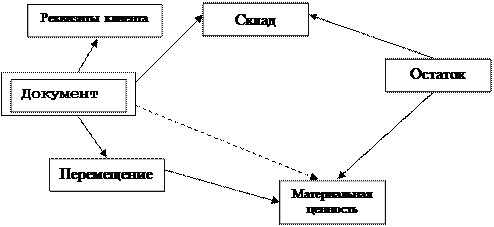 Рис.5.Структура сущность-связь. Если один документ связан со многими перемещениями (например, один товар и несколько цен) то связь называется один ко многим. Если материальная ценность связана со многими перемещениями, то связь называется многие к одному. Кроме того, существуют следующие связи: один к одному и многие ко многим. Достоинства: наглядность, быстрая работа с данными. Недостатки: сложность описания, нет стандартных средств описания сетевой модели.