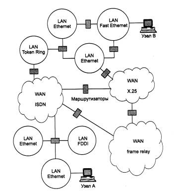 Рис. 3. Архитектура составной сети Подсети соединяются между собой маршрутизаторами. Компонентами составной сети могут являться как локальные, так и глобальные сети. Внутренняя структура каждой сети на рисунке не показана, так как она не имеет значения при рассмотрении сетевого протокола. Все узлы в пределах одной подсети взаимодействуют, используя единую для них технологию. Так, в составную сеть, показанную на рисунке, входит несколько сетей разных технологий: локальные сети Ethernet, Fast Ethernet, Token Ring, FDDI и глобальные сети frame relay, X.25, ISDN. Каждая из этих технологий достаточна для того, чтобы организовать взаимодействие всех узлов в своей подсети, но не способна построить информационную связь между произвольно выбранными узлами, принадлежащими разным подсетям, например между узлом А и узлом В на рис. 3. Следовательно, для организации взаимодействия между любой произвольной парой узлов этой «большой» составной сети требуются дополнительные средства. Такие средства и предоставляет сетевой уровень. Сетевой уровень выступает в качестве координатора, организующего работу всех подсетей, лежащих на пути продвижения пакета по составной сети. Для перемещения данных в пределах подсетей сетевой уровень обращается к используемым в этих подсетях технологиям. Хотя многие технологии локальных сетей (Ethernet, Token Ring, FDDI, Fast Ethernet и др.) используют одну и ту же систему адресации узлов на основе МАС - адресов, существует немало технологий (X.25, АТМ, frame relay), в которых применяются другие схемы адресации. Адреса, присвоенные узлам в соответствии с технологиями подсетей, называют локальными. Чтобы сетевой уровень мог выполнить свою задачу, ему необходима собственная система адресации, не зависящая от способов адресации узлов в отдельных подсетях, которая позволила бы на сетевом уровне универсальным и однозначным способами идентифицировать любой узел составной сети. Естественным способом формирования сетевого адреса является уникальная нумерация всех подсетей составной сети и нумерация всех узлов в пределах каждой подсети. Таким образом, сетевой адрес представляет собой пару: номер сети (подсети) и номер узла. В качестве номера узла может выступать либо локальный адрес этого узла (такая схема принята в стеке IPX/SPX), либо некоторое число, никак не связанное с локальной технологией, которое однозначно идентифицирует узел в пределах данной подсети. В первом случае сетевой адрес становится зависимым от локальных технологий, что ограничивает его применение. Например, сетевые адреса IPX/SPX рассчитаны на работу в составных сетях, объединяющих сети, в которых используются только МАС - адреса или адреса аналогичного формата. Второй подход более универсален, он характерен для стека TCP/IP. И в том и другом случае каждый узел составной сети имеет наряду со своим локальным адресом еще один - универсальный сетевой адрес. Данные, которые поступают на сетевой уровень и которые необходимо передать через составную сеть, снабжаются заголовком сетевого уровня. Данные вместе с заголовком образуют пакет. Заголовок пакета сетевого уровня имеет унифицированный формат, не зависящий от форматов кадров канального уровня тех сетей, которые могут входить в объединенную сеть, и несет наряду с другой служебной информацией данные о номере сети, которой предназначается этот пакет. 