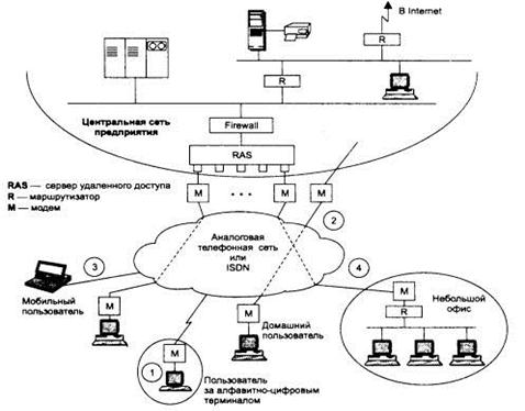 Удаленный доступ - очень широкое понятие, которое включает в себя различные типы и варианты взаимодействия компьютеров, сетей и приложений. Если рассматривать все многочисленные схемы взаимодействия, которые обычно относят к удаленному доступу, то всем им присуще использование глобальных каналов или глобальных сетей при взаимодействии.Для удаленного доступа, как правило, характерна схема, когда, с одной стороны, имеется центральная крупная сеть или центральный компьютер, а с другой - отдельный удаленный терминал, компьютер или небольшая сеть, которые хотят получить доступ к ресурсам центральной сети. Количество удаленных от центральной сети узлов и сетей, требующих этот доступ, постоянно растет, поэтому современные средства удаленного доступа рассчитаны на поддержку большого количества удаленных клиентов. Типы взаимодействующих систем На рис. 1 приведены основные схемы удаленного доступа, отличающиеся типом взаимодействующих систем: