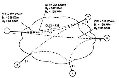 Рис. 1. Пример использования сети frame relay Параметры качества обслуживания могут быть различными для разных направлений виртуального канала. Так, на рис. 1 абонент 1 соединен с абонентом 2виртуальным каналом. При направлении от абонента 1 к абоненту 2 канал имеет среднюю скорость 128 Кбит/с с пульсациями Вс=256 Кбит (интервал Т составил 1 с) и Ве=64 Кбит. А при передаче кадров в обратном направлении средняя скорость уже может достигать значения 256 Кбит/с с пульсациями Вс=512 Кбит и Ве=128 Кбит. Механизм заказа средней пропускной способности и максимальной пульсации является основным механизмом управления потоками кадров в сетях frame relay. Соглашения должны заключаться таким образом, чтобы сумма средних скоростей виртуальных каналов не превосходила возможностей портов коммутаторов. При заказе постоянных каналов за это отвечает администратор, а при установлении коммутируемых виртуальных каналов - программное обеспечение коммутаторов. При правильно взятых на себя обязательствах сеть борется с перегрузками путем удаления кадров с признаком DE=1 и кадров, превысивших порог Вс+Ве. Тем не менее в технологии frame relay определен еще и дополнительный (необязательный) механизм управления кадрами. Это механизм оповещения конечных пользователей о том, что в коммутаторах сети возникли перегрузки (переполнение необработанными кадрами). Специальный Биты кадра извещают об этом принимающую и передающую сторону. На основании значения этих битов принимающая сторона должна с помощью протоколов более высоких уровней (TCP/IP, SPX и т. п.) известить передающую сторону о том, что та должна снизить интенсивность отправки пакетов в сеть. При создании коммутируемого виртуального канала параметры качества обслуживания передаются в сеть с помощью протокола Q.931. Этот протокол устанавливает виртуальное соединение с помощью нескольких служебных пакетов. Абонент сети frame relay, который хочет установить коммутируемое виртуальное соединение с другим абонентом, должен передать в сеть по каналу D сообщение, которое имеет несколько параметров, в том числе: адрес назначения максимальный размер кадра в данном виртуальном соединении; запрашиваемое значение CIR для двух направлений; запрашиваемое значение Вс для двух направлений; запрашиваемое значение Be для двух направлений. Коммутатор, с которым соединен пользователь, анализирует параметры, указанные в пакете, и если коммутатор может их удовлетворить (располагая, естественно, информацией о том, какие виртуальные каналы на каждом порту он уже поддерживает), то пересылает сообщение следующему коммутатору. Следующий коммутатор выбирается по таблице маршрутизации. Если все коммутаторы на пути к конечному узлу согласны принять запрос, то создается виртуальный канал. По виртуальному каналу могут передаваться данные.