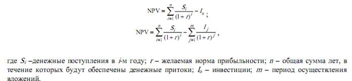Методы оценки инвестиционных проектов подразделяются на 2 категории: 1. Основанные на дисконтированных оценках. 2. Основанные на учётных оценках. К первой категории относятся методы определения чистой текущей стоимости, индекса рентабельности инвестиций, внутренней нормы прибыли, дисконтированного срока окупаемости. Ко второй категории относятся методы определения коэффициента эффективности инвестиций, недисконтированного срока окупаемости. Дадим характеристику каждого из методов: 1. Метод расчёта чистой текущей стоимости, NPV (net present value).