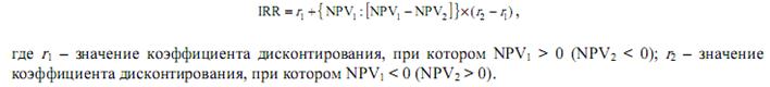 Проект принимается в случае, когда индекс рентабельности больше 1. 3. Метод расчёта внутренней нормы прибыли, IRR (internal rate of return) или внутреннего коэффициента окупаемости инвестиций. Характеризует коэффициент дисконтирования, при котором чистая текущая стоимость проекта равна нулю. Показывает максимально допустимый относительный уровень расходов, которые может позволить себе предприятие при реализации данного проекта. Например, если проект полностью финансируется за счёт ссуды коммерческого банка, то значение IRR показывает верхнюю границу допустимого уровня банковской процентной ставки, превышение которого делает проект убыточным. Критерий рассчитывается методом линейной аппроксимации.